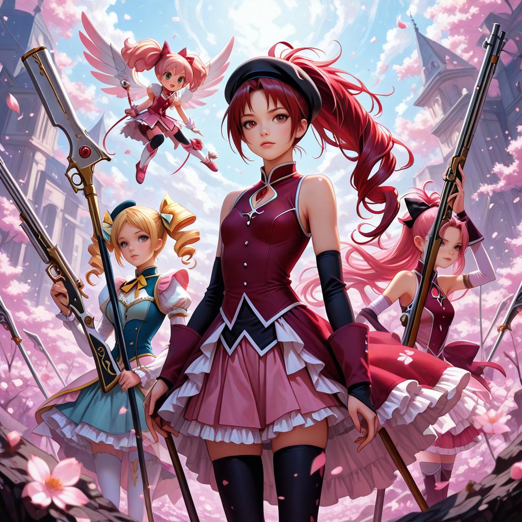 Beatrice_umineko,6girls,multiple girls,blonde hair,hat,red hair,stakes of purgatory,bow,necktie,hair ornament,blue hair,drill hair,twintails,butterfly,bug,dress,top hat,armband,black hair,pink headwear,hair bobbles