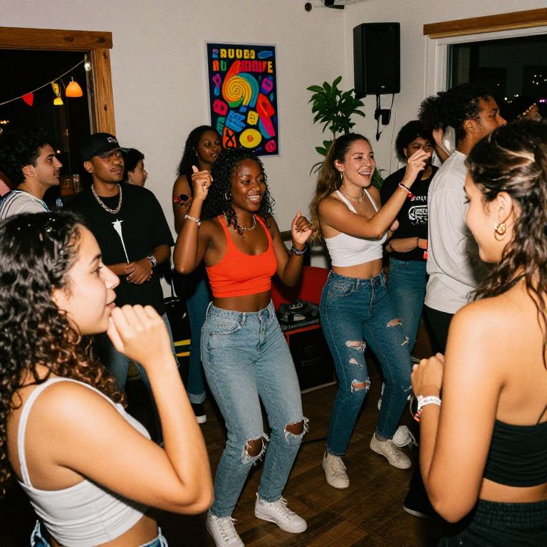 Vibrant houseparty scene featuring a mix of music, dancing, and casual conversations, energetic crowd with diverse fashion styles, colorful decorations, casual indoor setting with posters and plants, warm tones, cinematic lighting