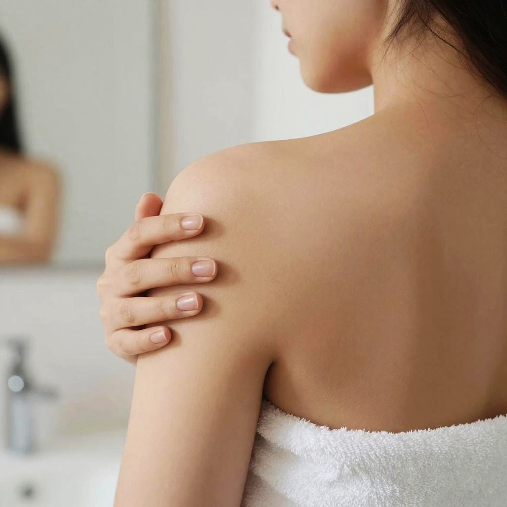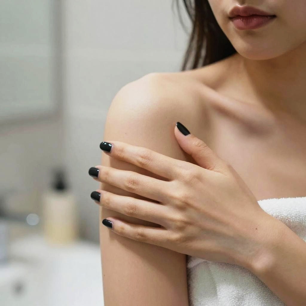 1girl, solo, realistic, blurry, towel, blurry background, naked towel, head out of frame, photorealistic, nail polish, bathroom, depth of field, fingernails, indoors, upper body, mole, black nails, from side, lips, mole on arm, bare shoulders, closed mouth, hand on own arm