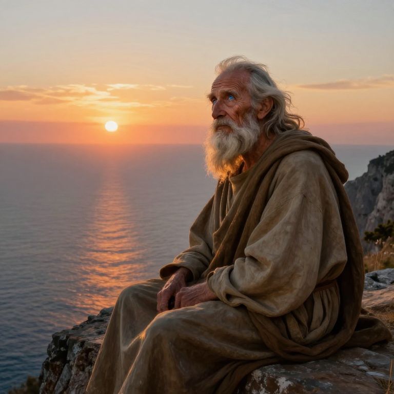 Imagine a hyperrealistic portrait of an aged sage, his sun-baked skin adorned with deep wrinkles and piercing azure eyes, perched atop a rocky cliff overlooking the vast sea at sunset. The scene blends Renaissance art's precision with impressionist brushstrokes' fluidity, capturing nature's serene beauty as the sun dips below the horizon. Bathed in warm golden light, the sage's weathered face reflects a life of experience and knowledge; his expression exudes tranquility and contemplation. This unique aerial perspective invites viewers to share in his quiet awe at the breathtaking panorama, an emotional gradient evoking both peace and introspection.