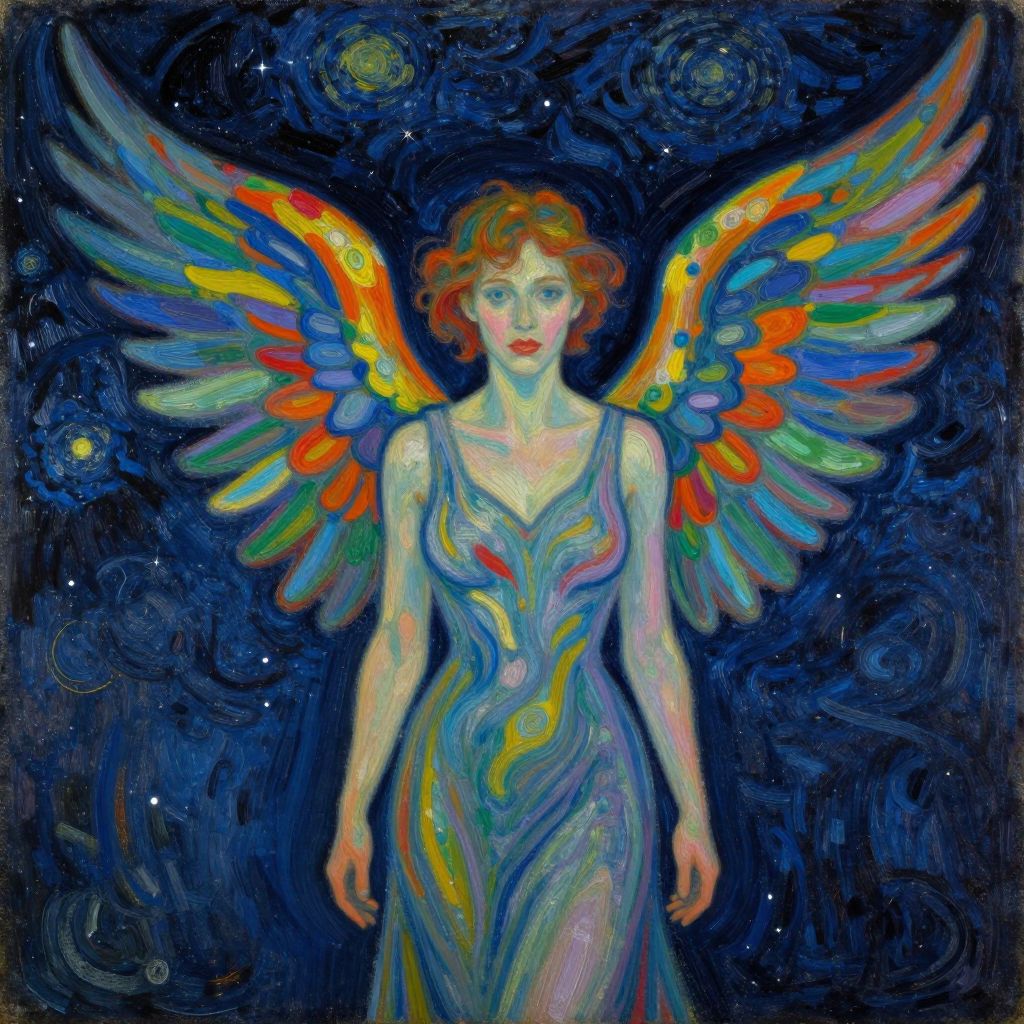Vibrant, colorful painting of a red-haired angel with large, multicolored wings, wearing a flowing, blue-purple dress, set against a