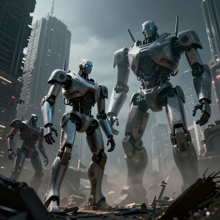 Digital CGI of three futuristic, silver robotic warriors standing in a dystopian, ruined cityscape with tall, damaged skyscrapers and smoky sky.