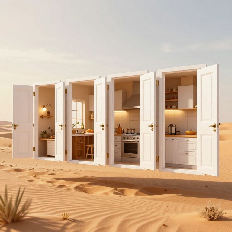 In a surreal 3D-rendered desert landscape, a row of floating white doors swings open and shut on unseen hinges, each revealing glimpses into cozy kitchens where impossible recipes cook themselves under golden-hour lighting.