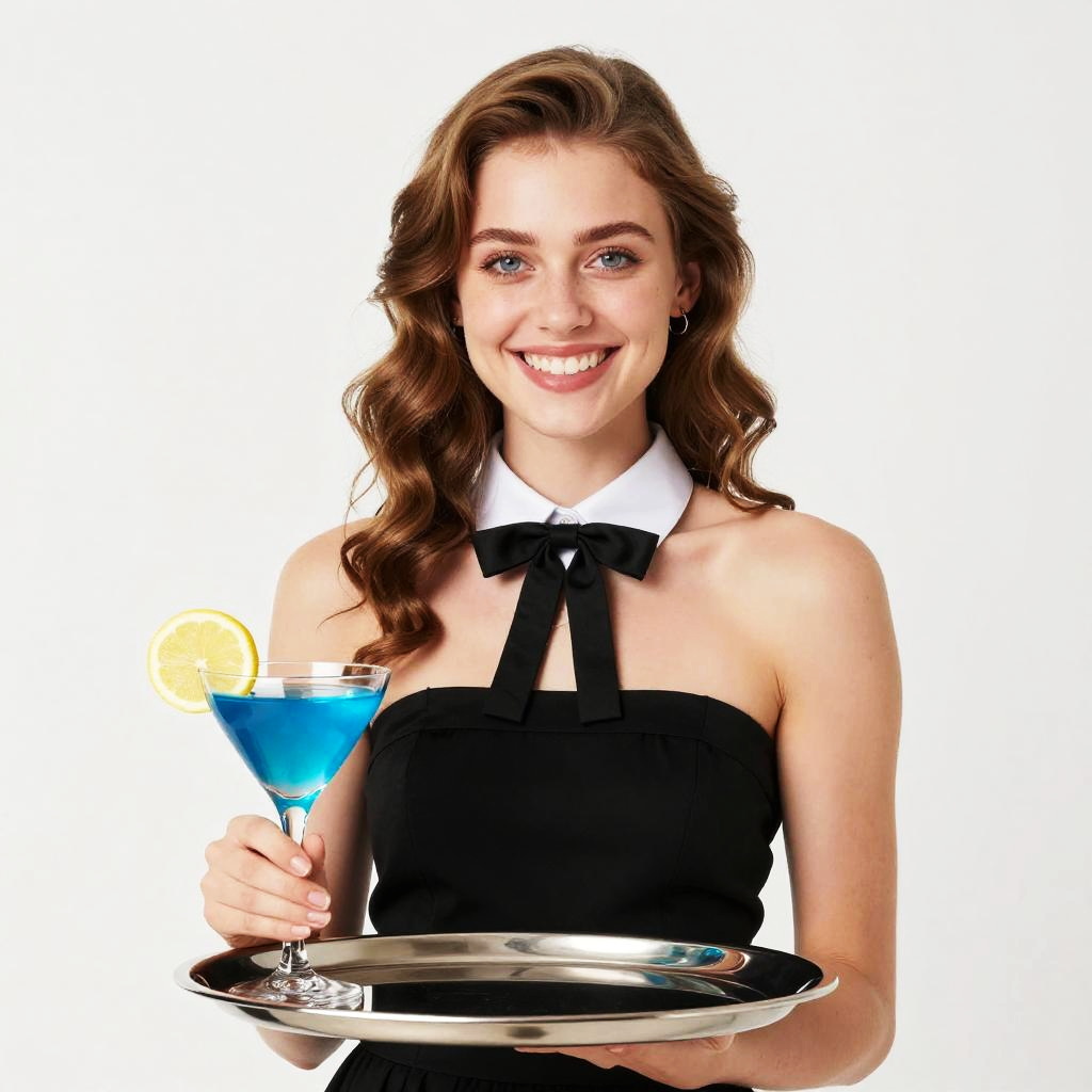Photograph of two smiling, curly-haired women in black-and-white striped tops, sipping colorful drinks (red, blue, orange) at a wooden