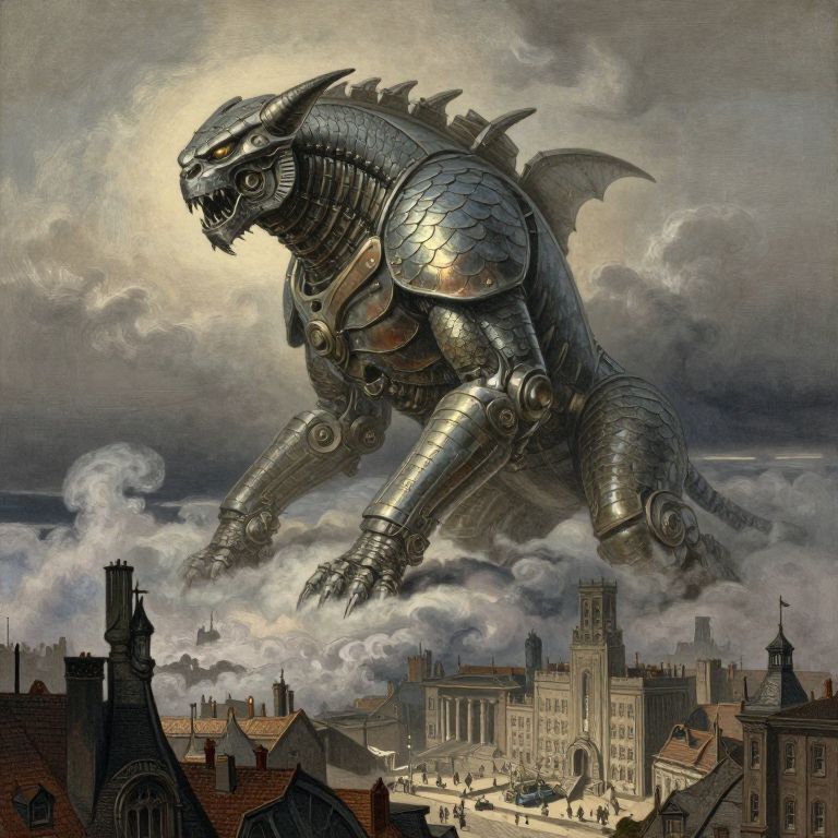 Craft an image embodying the grandiose style reminiscent of Gustave Doré, portraying a colossal mechanical creature emerging from beneath an overcast sky. This awe-inspiring beast, with its metallic scales reflecting stormy hues and casting shadows over a bustling Victorian-era cityscape below, evokes a sense of wonderment and trepidation in viewers as they witness the fusion of mythical beast and industrial marvel. From a high vantage point above the clouds, this atmospheric scene conveys the tension between progress and the unknown, capturing the essence of Doré's detailed and dynamic illustrations without directly referencing his name.