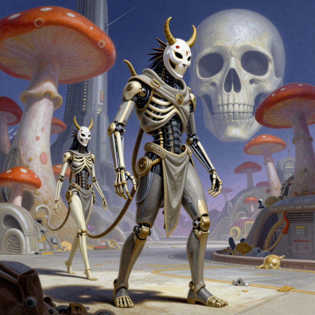 This digital CGI image depicts a futuristic, fantasy scene with two humanoid robot skeletons with white skulls, black spines, and golden horns. They wear metallic armor and grey cloaks, standing on a paved surface amidst giant red and white mushrooms. The background features a massive glowing skull and sci-fi buildings. The robots have a muscular build, with one taller and more prominent in the foreground, while the smaller one follows behind. The sky is a deep blue, enhancing the surreal, otherworldly atmosphere. Scattered debris and small creatures are on the ground, adding to the fantasy setting.