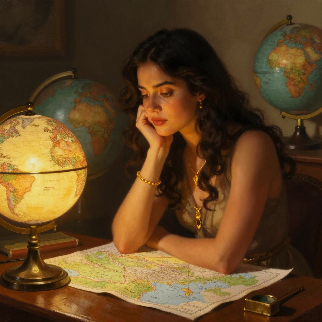 A digital painting of a beautiful, dark-haired woman with wavy hair and fair skin, wearing gold jewelry, sitting at a wooden desk illuminated by a globe lamp. She's focused on a map, resting her chin on her hand. The background has more globes and dim, warm lighting, creating a vintage, scholarly atmosphere. Her expression is thoughtful and serene.