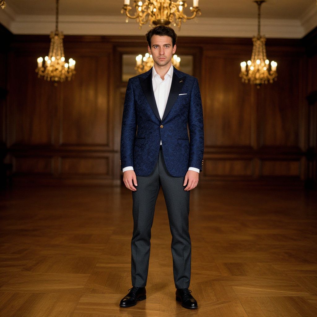 A man, navy blue brocade blazer with gold accents, white cotton dress shirt, slim-fit charcoal trousers, classic black oxford shoes, historic hotel ballroom, ornate chandeliers, elegant wooden paneling, Ilford film stock, confident expression Man has masculine face and piercing eyes