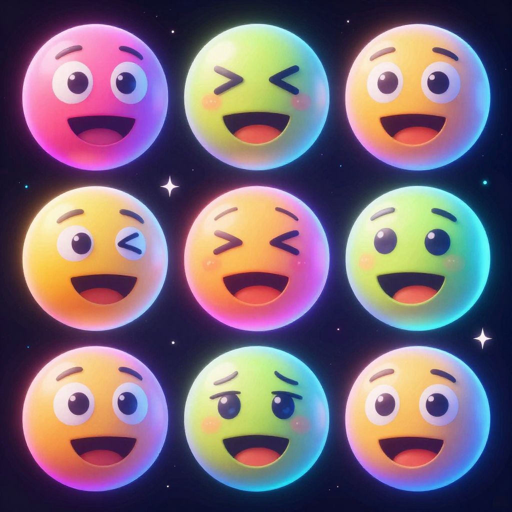 Free AI emoji generator interface on a holographic screen with a diverse set of newly created expressive emojis, sleek minimalistic design with smooth transitions, soft pastel colors combined with cyberpunk neon accents, modern tech environment focusing on emotional communication.