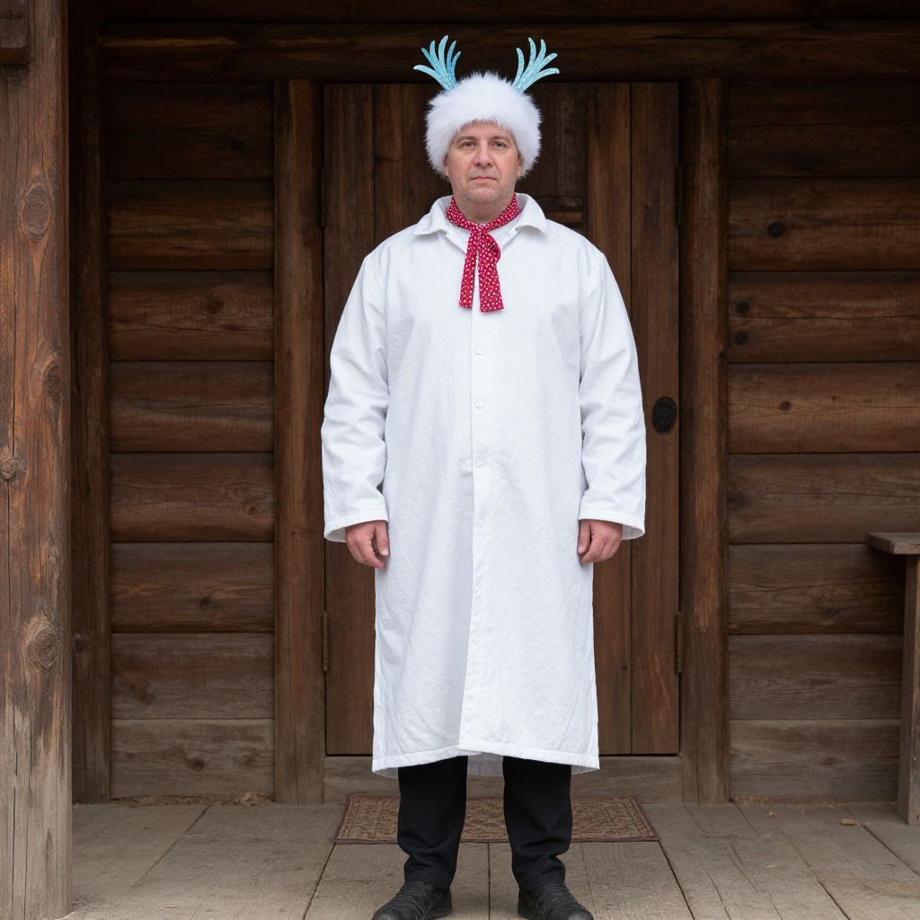Photograph of an older white man standing in front of a wooden cabin door. He wears a long, white, lab coat-like garment with a bright red polka-dotted scarf around his neck and a white fuzzy hat with blue antlers. His expression is neutral, and he stands with his arms relaxed at his sides. He wears black pants and black shoes. The wooden door behind him has a rustic, weathered texture. The ground is paved with stone tiles. The overall style is whimsical and slightly festive.