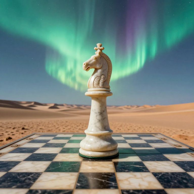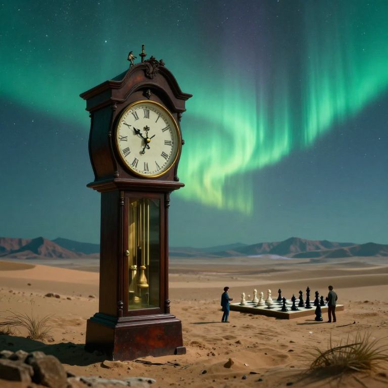 A surreal landscape bathed in the ethereal glow of an aurora borealis, reminiscent of Dali-esque dreamscapes. A colossal grandfather clock looms in the foreground, its hands frozen at peculiar angles; tiny, distorted figures appear to engage in a chess match on the clock face's surface. In the background, an expansive desert extends under a starlit sky, with distant mountains gradually dissolving into hazy horizons. The scene conveys a sense of timelessness and dreamlike wonder, as if one has stumbled upon an alternate reality where logic surrenders to the whims of imagination.