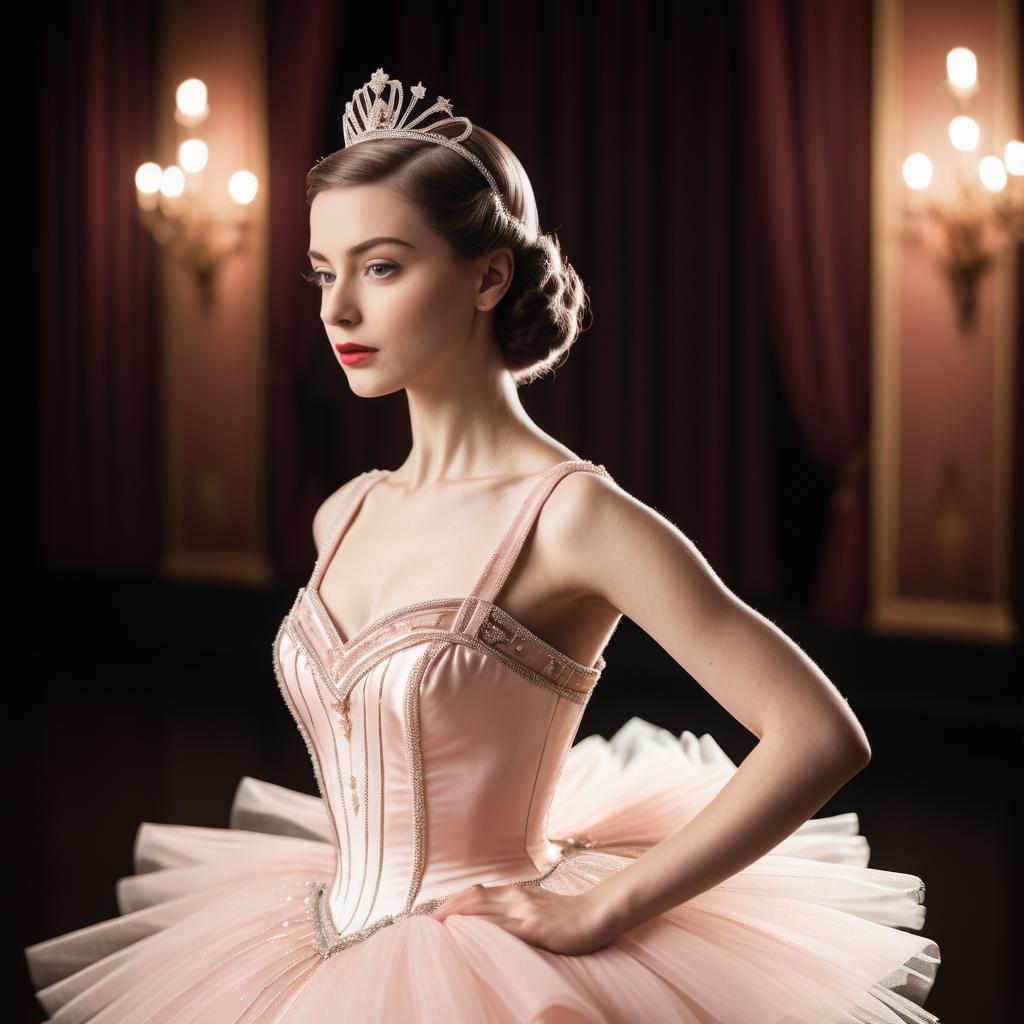 Vintage-inspired photograph of an elegant ballerina in a 1940s tutu, delicate tiara, soft blush makeup, theater stage background, cinematic lighting.