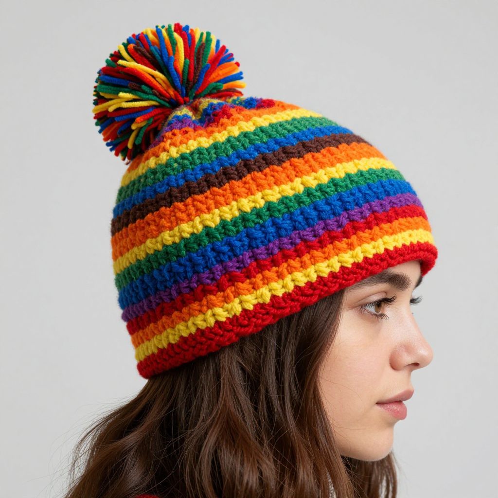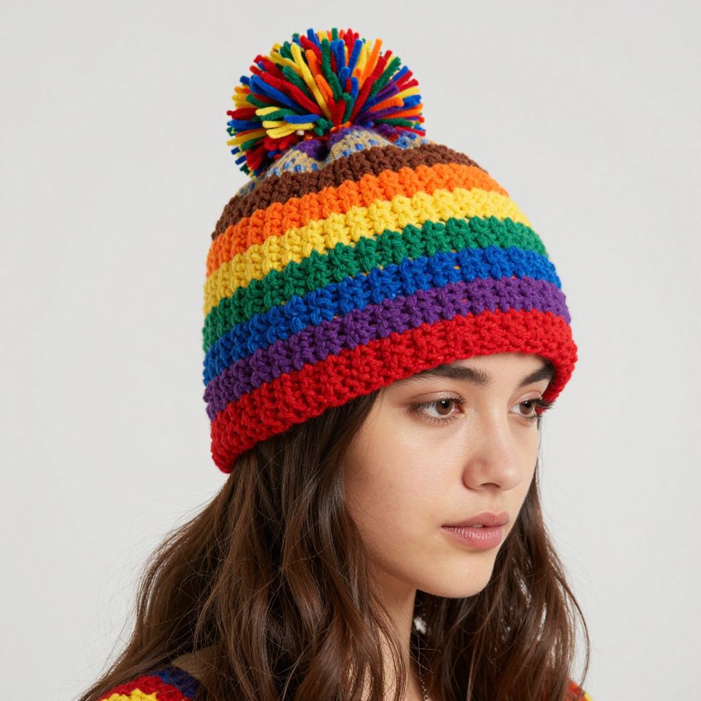 Woman wearing a vibrant, 1970s-inspired rainbow-striped crochet beanie featuring bold stripes of red, orange, yellow, green, blue, purple, and brown, complemented by a matching pom-pom atop her head.
