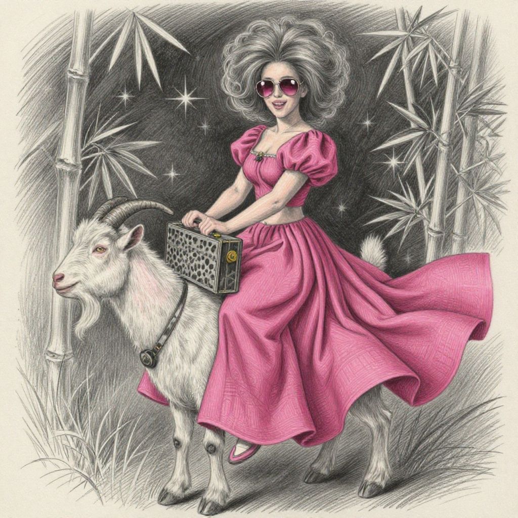 1girl, masterwork Pencil painting, masterpiece, highly detailed, long shot of an in a very Magical deep pink Southern Steel and Linen [Wide-leg pants and crop top:Maxi skirt and crop top:11], Human Callous stocky Lovecraftian Opera Singer (Male:1.3), he is riding a Goat, he is smiling, the Opera Singer has Oversized hair, the Opera Singer has a Homey Mughal Crimson aviator sunglasses, Briefcase, cheetah print grass with Bamboo, Stars in the sky, split diopter, Rough sketch, Hopeful, elegant, Ashcan School, Light and shadow plays, F/8, triadic colors, Cross Processing, matte, pale skin, realistic pretty face, Pixabay, artstation, (art by Hideyuki Kikuchi:1.2), gothic, flowing