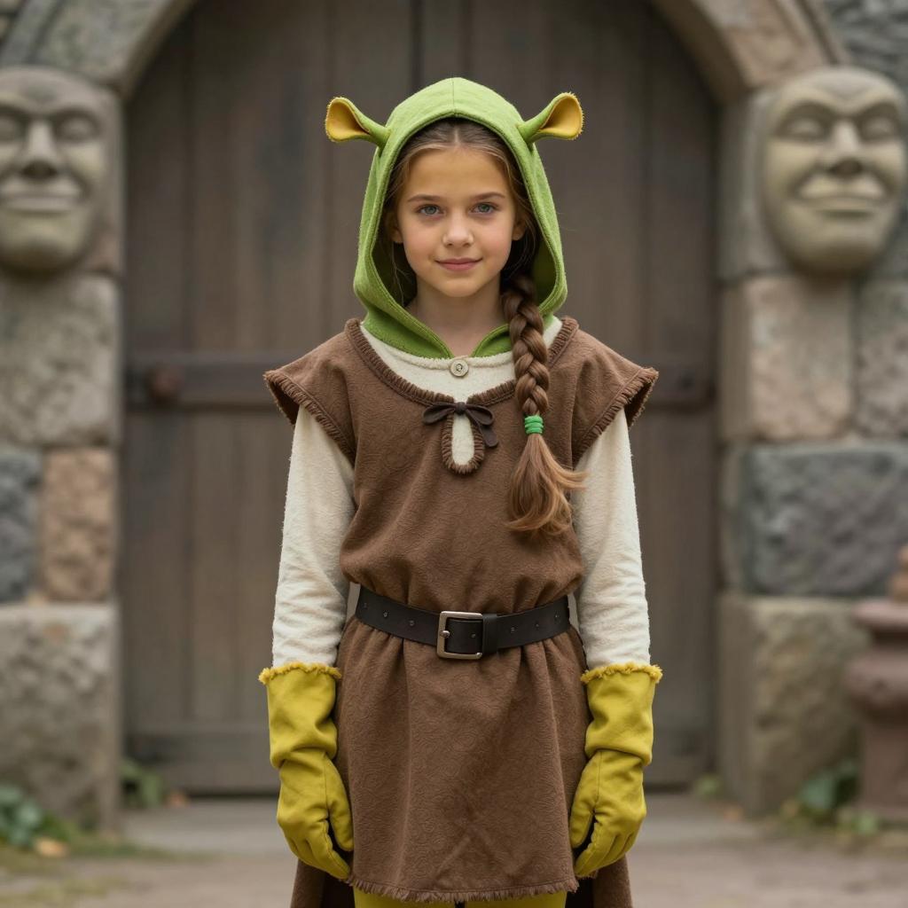 Dorothy wizard girls costume, photorealistic, young girl, standing indoors, medieval style, long dark green hooded cloak, white dress with black buttons and red sash, black boots, wavy brown hair, serious expression, stone wall background, ornate lantern, red carpet, soft daylight, realistic ures, detailed clothing, realistic lighting, slight shadow, historical setting, centered composition, detailed ures, high quality, cinematic style, realistic fashion, intricate details