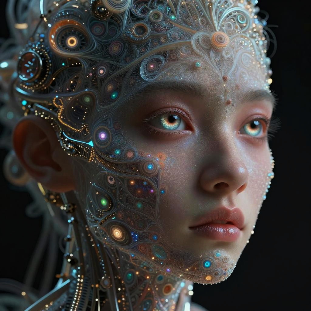 Ai watercolor portrait of a futuristic android with translucent skin revealing colorful watercolor veins, soft lighting, and intricate details, combining traditional painting techniques with sci-fi aesthetics in a harmonious and contemplative mood