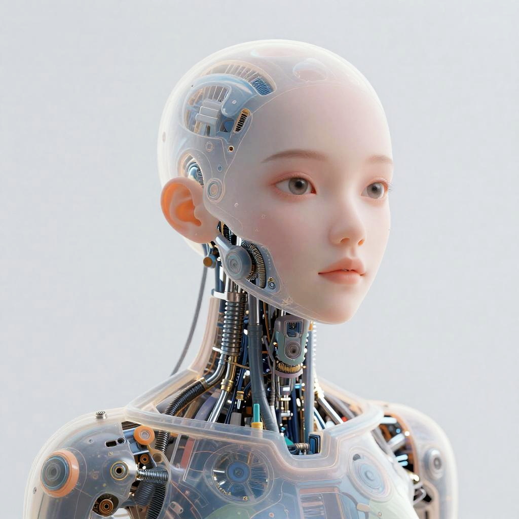 Digital art portrait of a female humanoid robot with a cybernetic head and neck, blending watercolor and digital effects. She has a pale, delicate face with soft pink lips, gazing to the right. Her mechanical parts, including visible circuitry and metallic joints, are adorned with splashes of blue, green, yellow, and white watercolor. The background is pure white, highlighting the contrast between her organic face and robotic features. Her eyes are slightly downcast, adding a sense of contemplation or melancholy. The overall style is futuristic and ethereal, merging human and machine elements seamlessly.