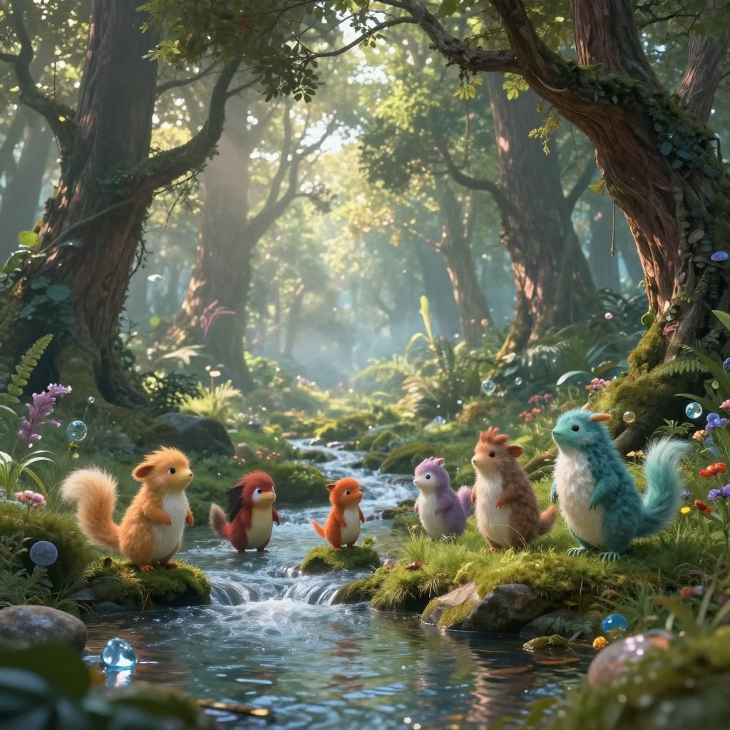 Magical forest creatures playing near a crystal-clear stream, enchanted forest background with towering oaks, soft rays of sunlight piercing through the mist, whimsical and dreamlike vibe