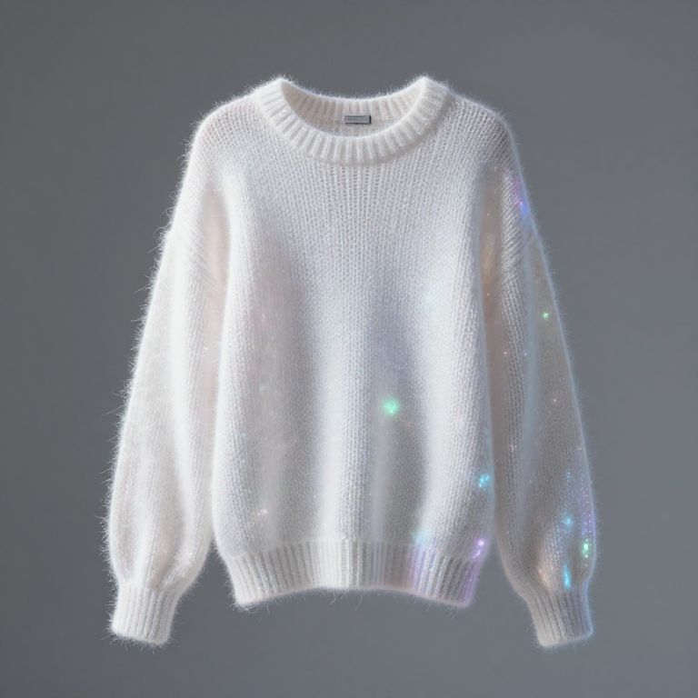 An ethereal sweater hangs suspended in mid-air, its textured knit shimmering with an otherworldly glow, as if woven from memories themselves.