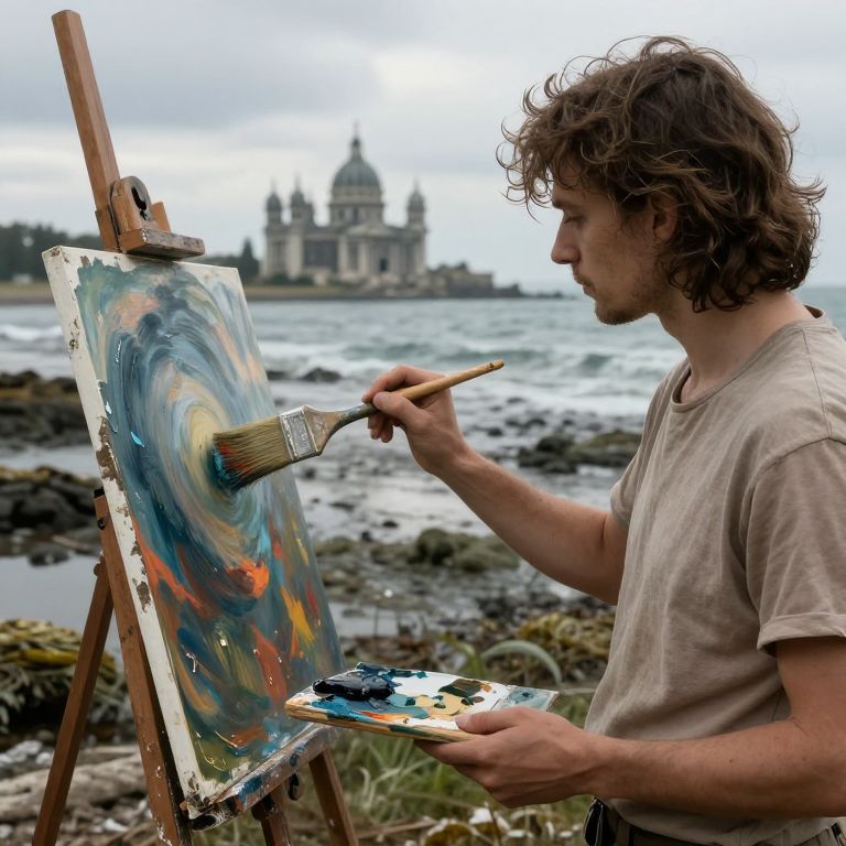 Young artist with curly brown hair painting vibrant abstract on easel by rocky coastal shore, using brush, with historic church in background.