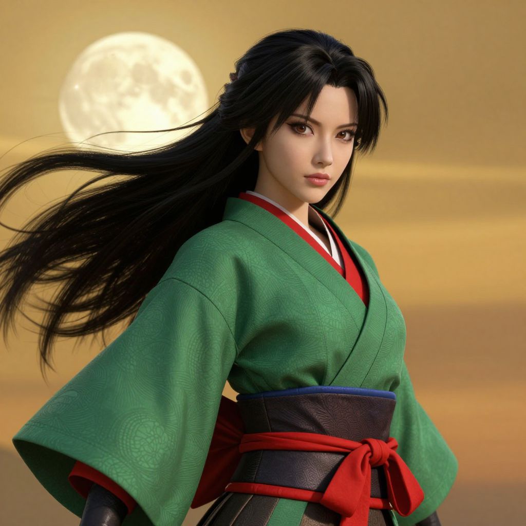 A digitally rendered illustration of a woman samurai with flowing black hair, adorned in traditional green and red attire, set against a dramatic golden-hour backdrop featuring a full moon, showcasing a blend of anime-inspired aesthetics and high-definition detail.