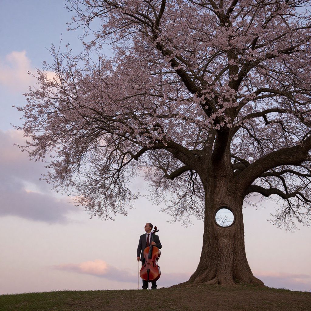 Photograph-style digital painting of a curly-haired man in black playing a wooden cello in a sunlit forest, with ferns and a small lantern