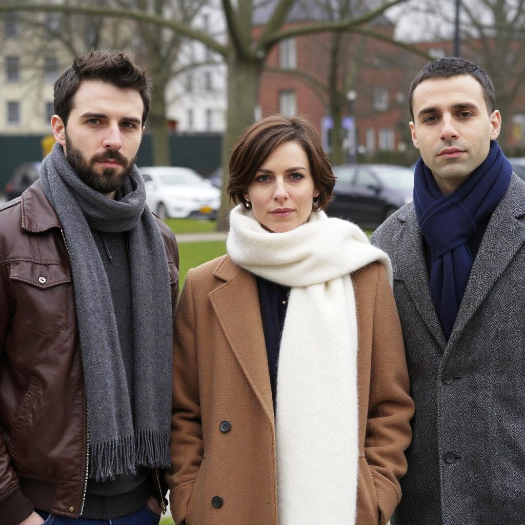Photograph of three people standing outdoors in a city park. Central person with short brown hair, white scarf, brown coat. Left person with dark brown hair, beard, grey scarf, brown leather jacket. Right person with short dark hair, blue scarf, grey herringbone coat. Background with trees, cars, and buildings. All three have neutral expressions.