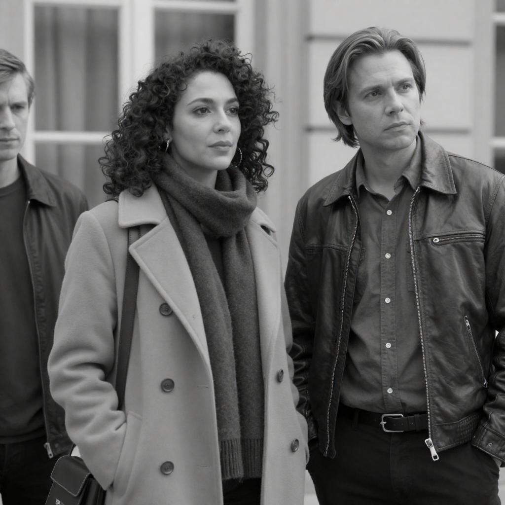 Black-and-white photograph of three people standing outdoors. A woman with curly hair, wearing a coat and scarf, stands in the center. To her right, a man with straight hair, wearing a leather jacket and button-up shirt, stands with a serious expression. Partially visible on the left, another person with short hair. Background includes a window with curtains.