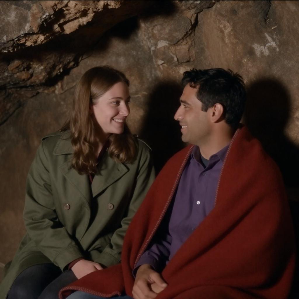 Photograph of a man and woman sitting close together in a dimly lit cave. The woman, with light brown hair and a green coat, smiles at the man, who has dark hair and wears a purple shirt with a red blanket. The rocky cave wall is ured and shadowy in the background.