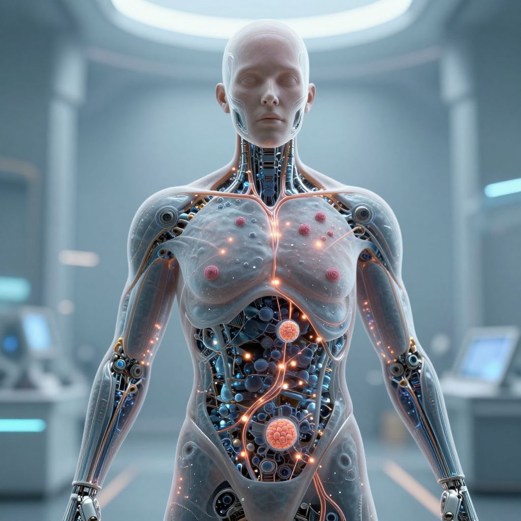 Nanotech concept art showing human body integration with microscopic nanobots repairing cells, bioluminescent particles flowing through veins, medical sci-fi environment, highly detailed organic-mechanical fusion, glowing effects, surreal and hopeful atmosphere
