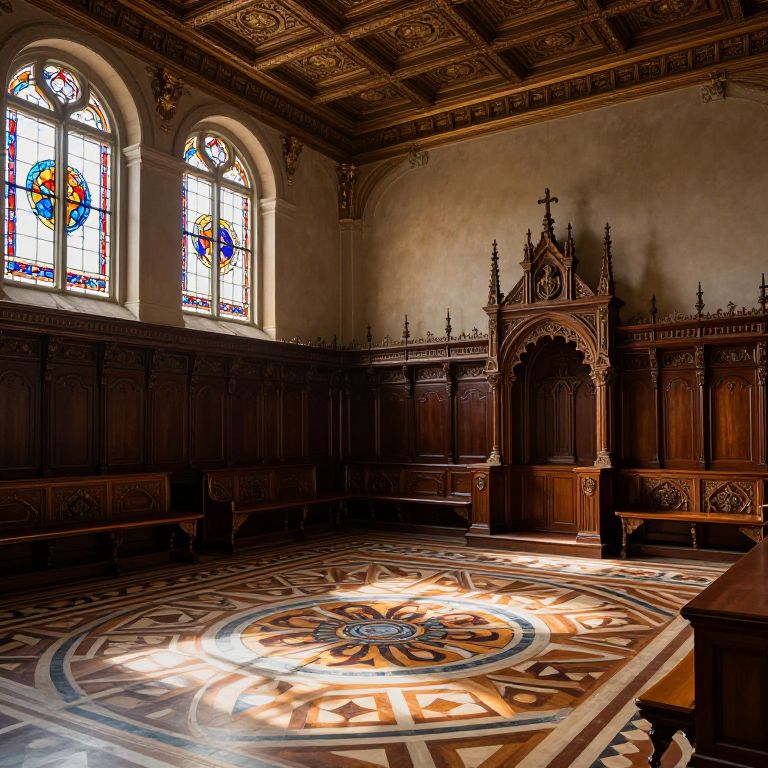 Photograph of a dimly lit, ornate church interior with stained glass windows, intricate wooden paneling, and a detailed mosaic floor. Sunlight