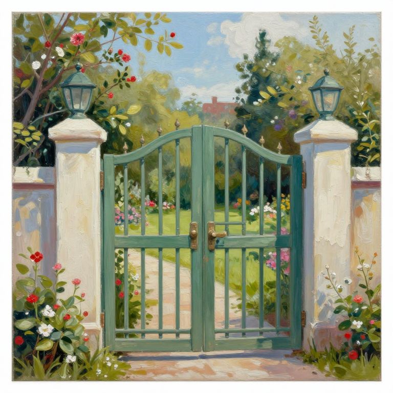 Colorful digital painting of a white Victorian-style glass greenhouse surrounded by vibrant flowers, potted plants, and a winding dirt path in a lush garden.