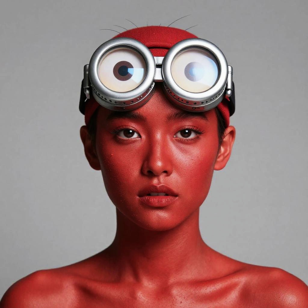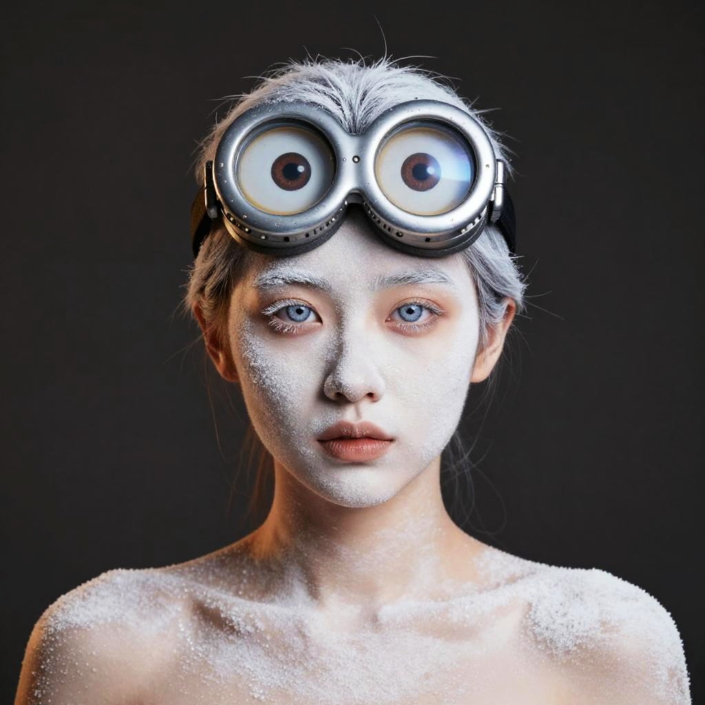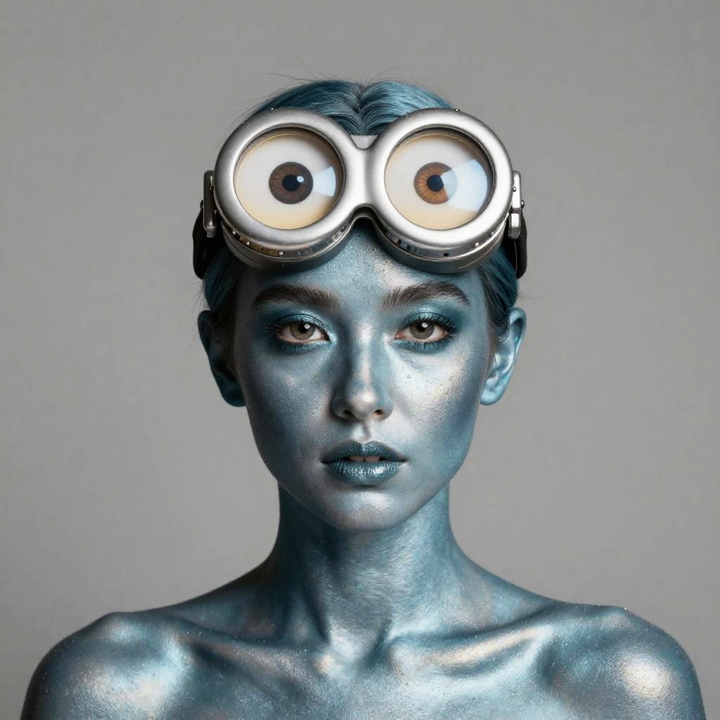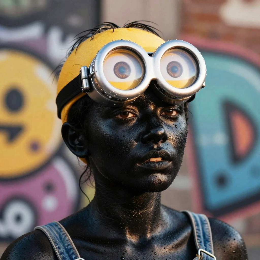 The burnt sienna makeup is expertly blended to cover her entire face, neck, and visible skin, creating a seamless transformation. The lighting is candlelight adding a soft glow to her face and emphasizing the reflective metallic shine of the goggles. The background is warm rustic background, allowing her transformed appearance to stand out as a complete and immersive Minion look.