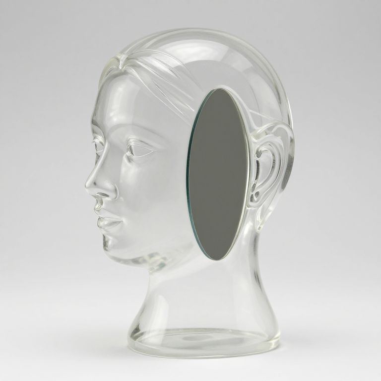 "Steam Power a sarah Lucas style sculpture made of transparent resin that shaped into a female head, and with a mirror in between the sculpture.,"
