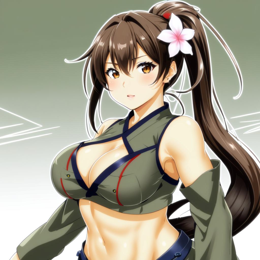 Amagi kai (kancolle), kantai collection, 1girl, brown eyes, hair between eyes, mole under eye, brown hair, long hair, ponytail, hair flower, large breasts, cleavage, cleavage cutout, navel, hip vent, bare shoulders, midriff, crop top, by artist azuma aya, anime