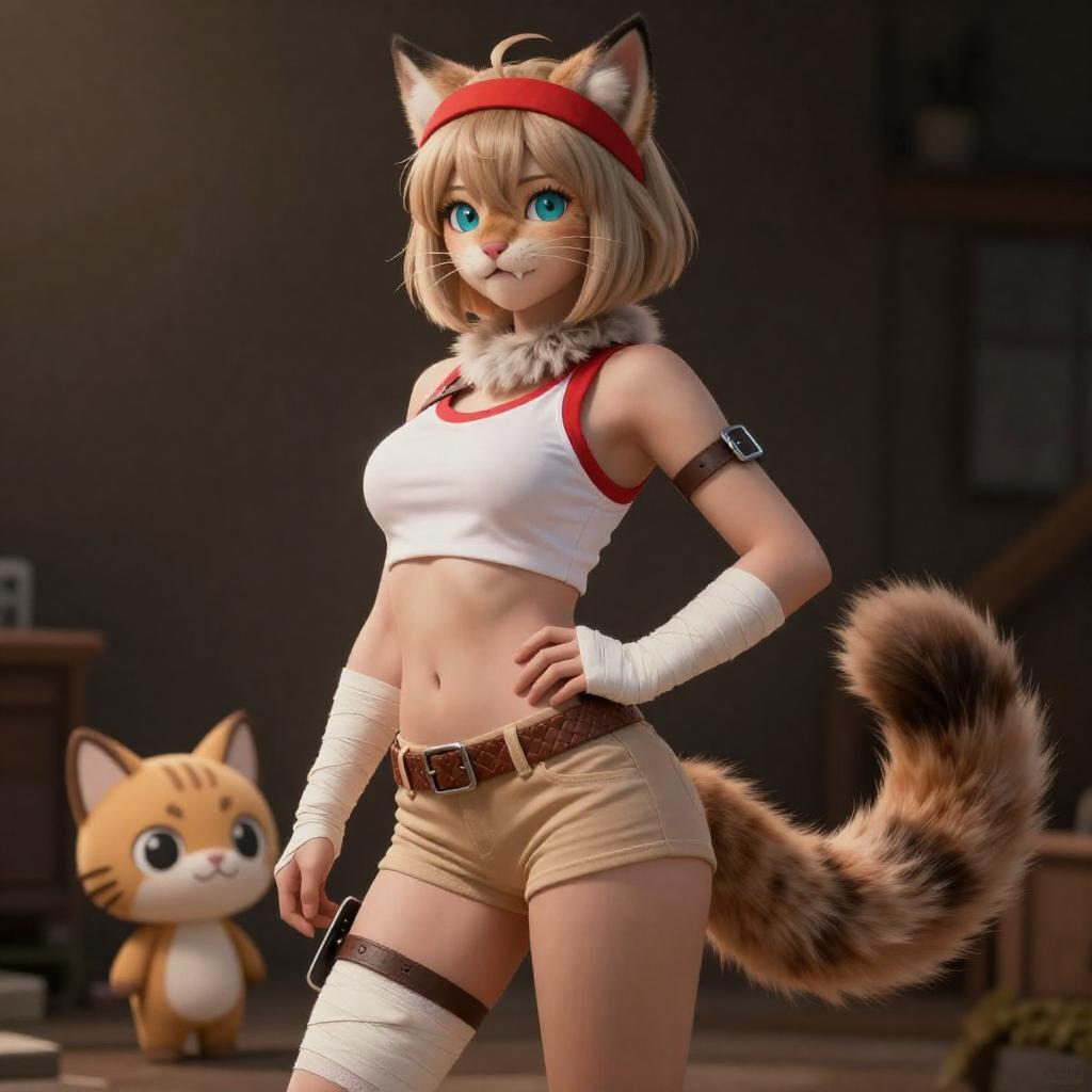 Nsfw, uploaded on e621, by Pixelsketcher, by Bayard Wu, by Thomas Benjamin Kennington, by Einshelm, (realistic:1.2), real life, shadow, jade the bobcat, lynx, female, furry anthro, cat ears, red headband, pink nose, (detailed clear aqua eyes), fangs, beige brown hair, fringe, ponytail, light tan body, strap around biceps, neck fur tuft, ((brown breast belt with buckle)), ((white and red crop top)), brown weave belt, light tan shorts, white bandaged hands, white bandaged arms, ((thigh knife strap)), (chibi:1.3), bandaged ankles, ((portrait)), , standing seductively, dynamic pose, camel toe, (bobcat tail), (detailed Bonifasko lighting), (fluffy fur), (detailed fur), (detailed skin), (smirk:1.1), masturbation, cinematic lighting, ((detailed forest background, waterfall, hills, tree)), wide angle view, (half body shadow:1.3), [backlighting], [[crepuscular ray]], [detailed ambient light], [gray natural lighting], [ambient light on the belly], (higher wildlife feral detail), outdoors, ocean view and beach, [realistic proportions], [explict content], [sharp focus], (questionable content), (shaded), ((masterpiece))