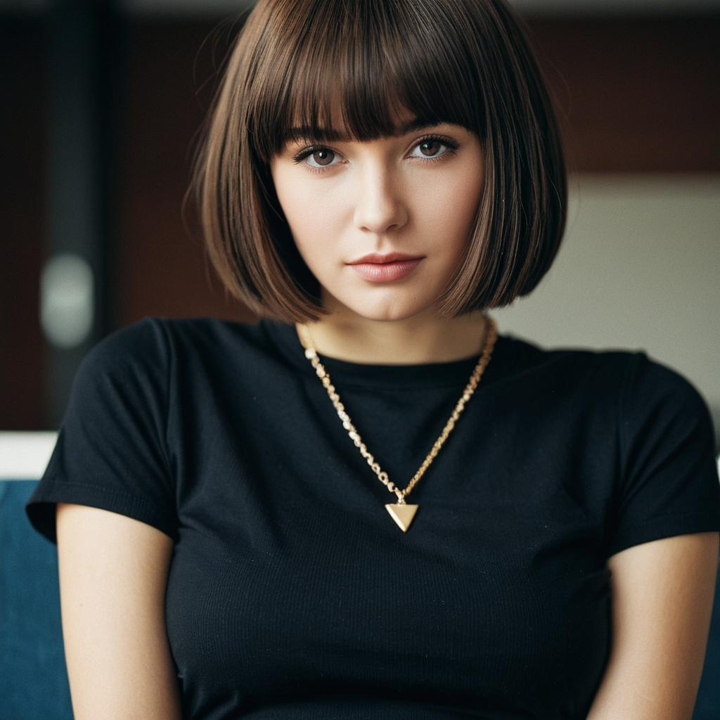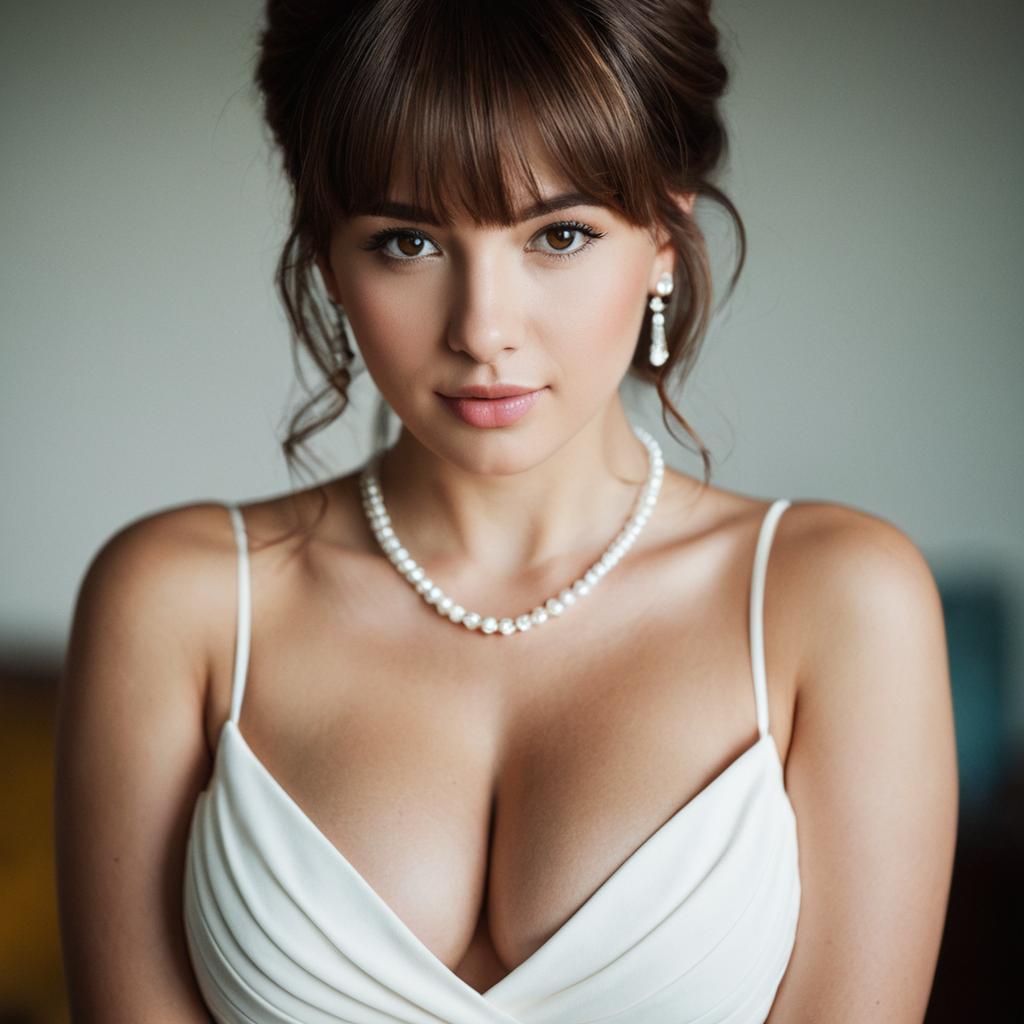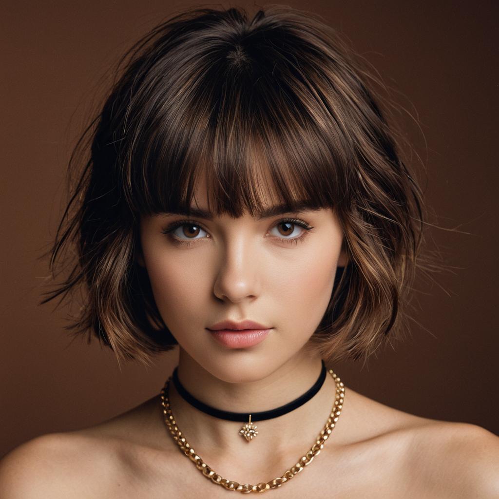 Soft curtain bangs short,1girl, solo, jewelry, brown hair, breasts, necklace, realistic, looking at viewer, cleavage, short hair, lips, upper body, collarbone, bare shoulders, medium breasts, off shoulder, shirt, blurry