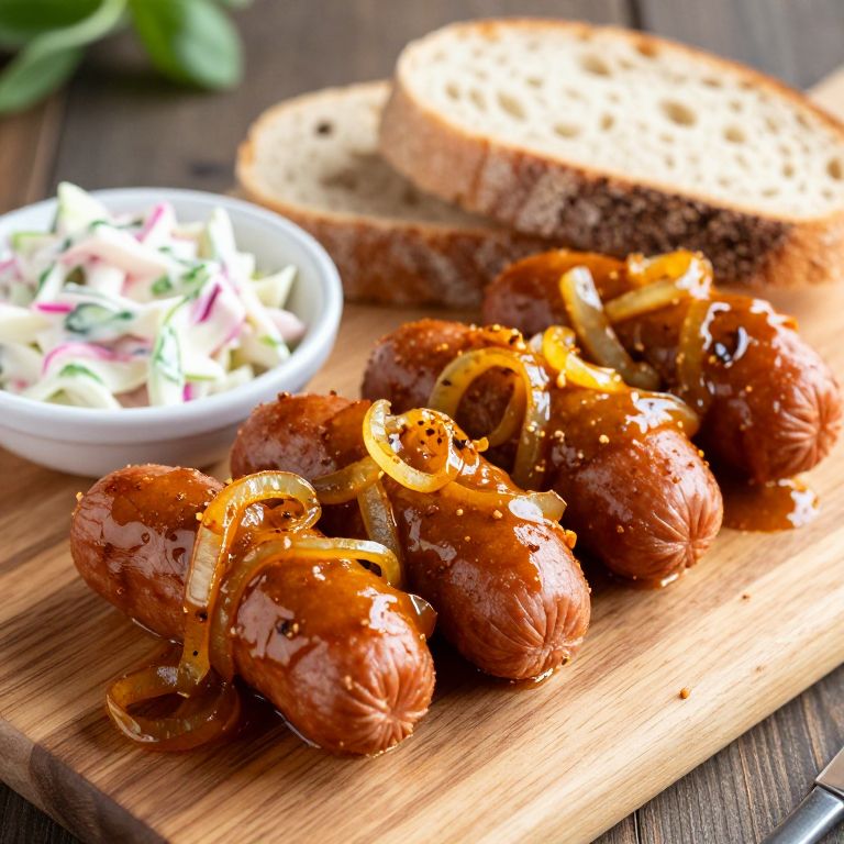 A gourmet twist on curryworst with artisanal sausage topped with spicy curry sauce and caramelized onions, served on a wooden board with artisan bread slices and side of tangy slaw, photographed with shallow depth of field highlighting textures and vibrant hues