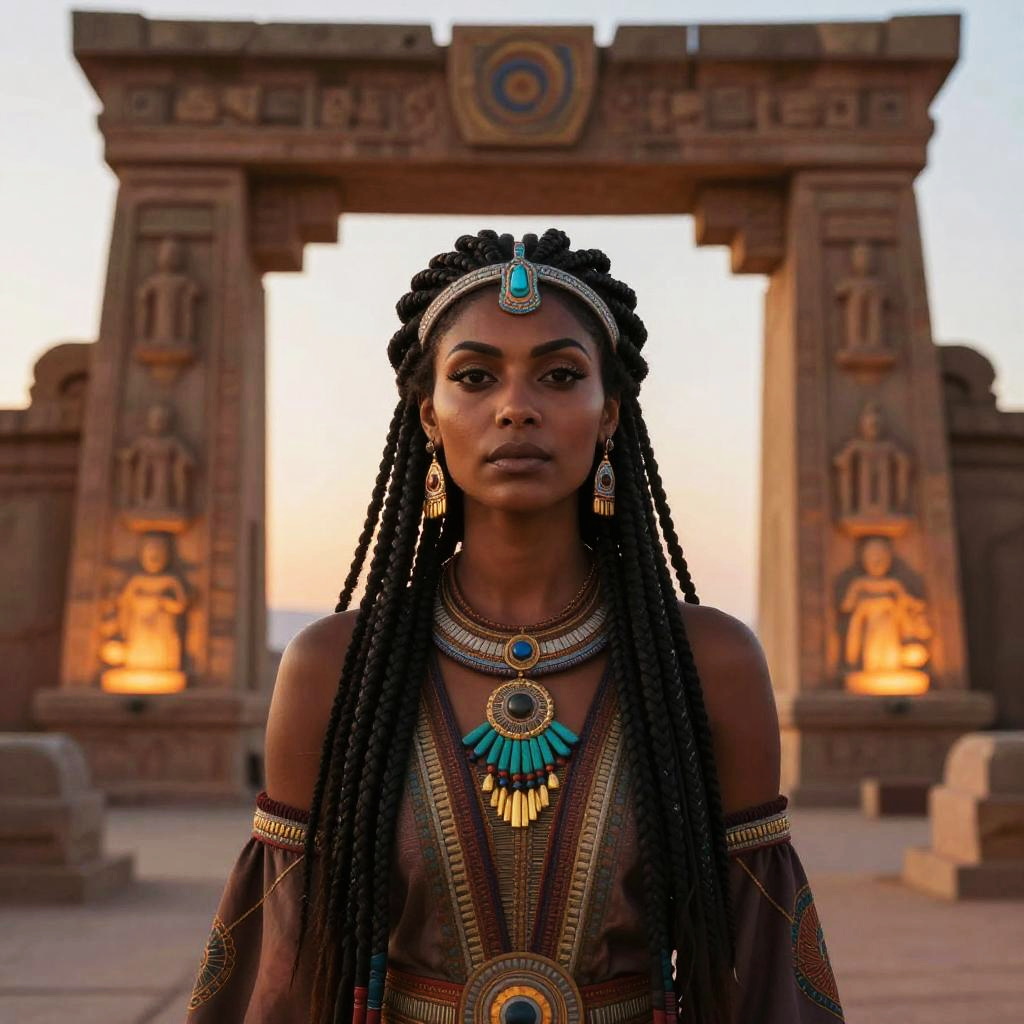 Assyrian girl adorned in ornate silver headpiece and colorful robes, ancient cuneiform tablets scattered nearby, majestic ziggurat in the distance, mystical twilight ambiance