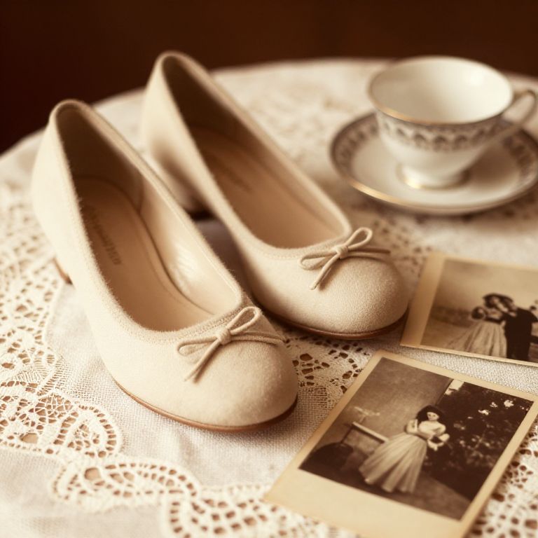 A photograph capturing a vintage, romantic setting. At the center are a pair of cream-colored, satin ballet flats with small, delicate bows on top. They rest on a white lace tablecloth with intricate floral patterns. To the right, there is a clear teacup with a matching saucer, both adorned with subtle gold trim. An open, sepia-toned photograph lies in front of the shoes, showing an elegant woman in a long dress. The background is softly blurred, focusing attention on the shoes, teacup, and lace. The warm, sepia-toned lighting adds a nostalgic, timeless feel to the image.