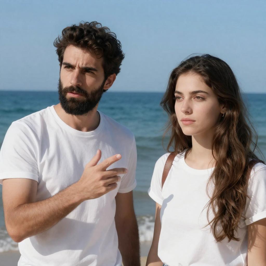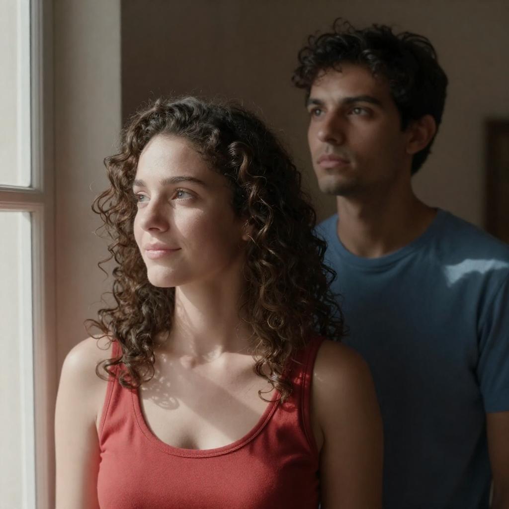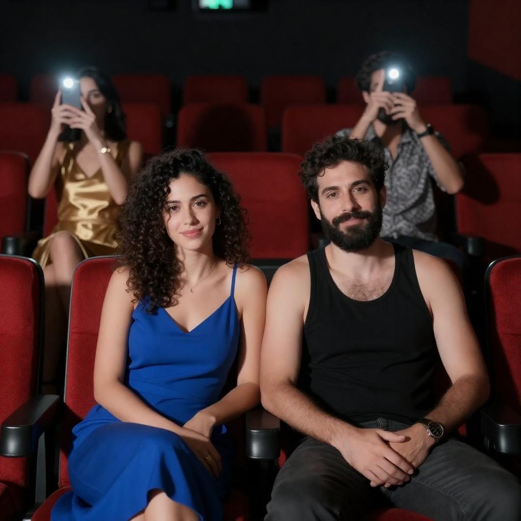 Photograph of a dimly lit movie theater with red cushioned seats. In the foreground, a bearded man in a black tank top and a woman with curly hair in a blue dress sit together, smiling. In the background, a woman in a gold dress and a man in a patterned shirt take photos with flash.