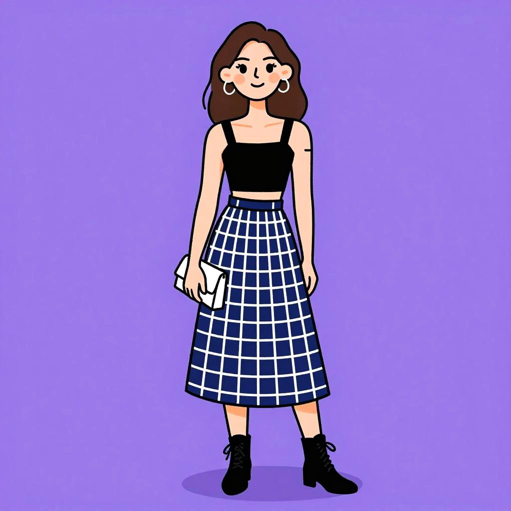 Digital drawing of a smiling woman with brown hair, wearing a black crop top, blue plaid skirt, black ankle boots, and holding a white clutch