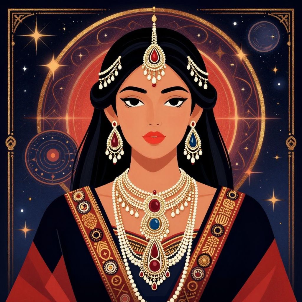 This striking illustration features a woman adorned in intricate jewelry and traditional attire, set against a backdrop rich in celestial motifs. The artwork combines elements of modern graphic design with a hint of ancient cultural symbolism, creating a captivating visual narrative.