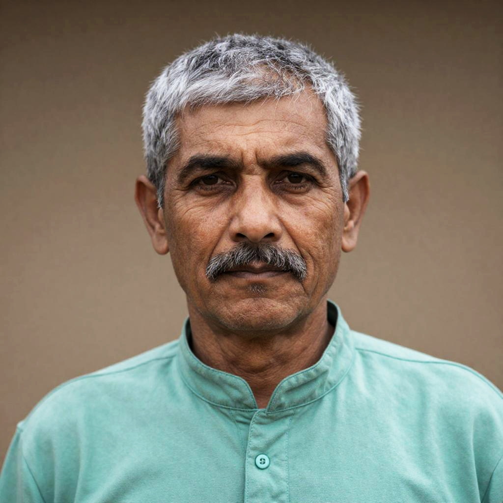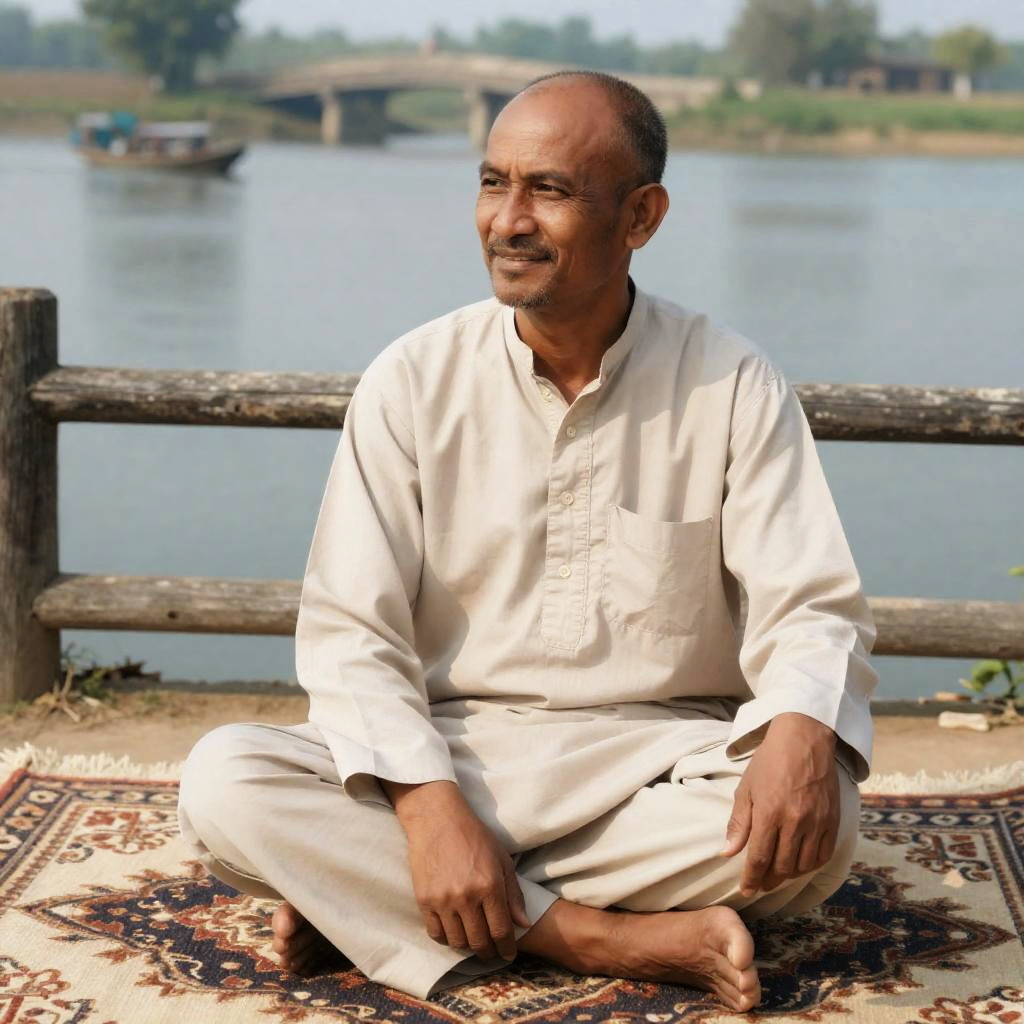 Middle-aged man with balding head, light skin, sitting cross-legged on patterned rug. Wearing light beige traditional clothing. Wooden fence in background. Calm river with bridge in distance. Bright daylight. Man smiling. Riverbank and boats visible. Rural setting.