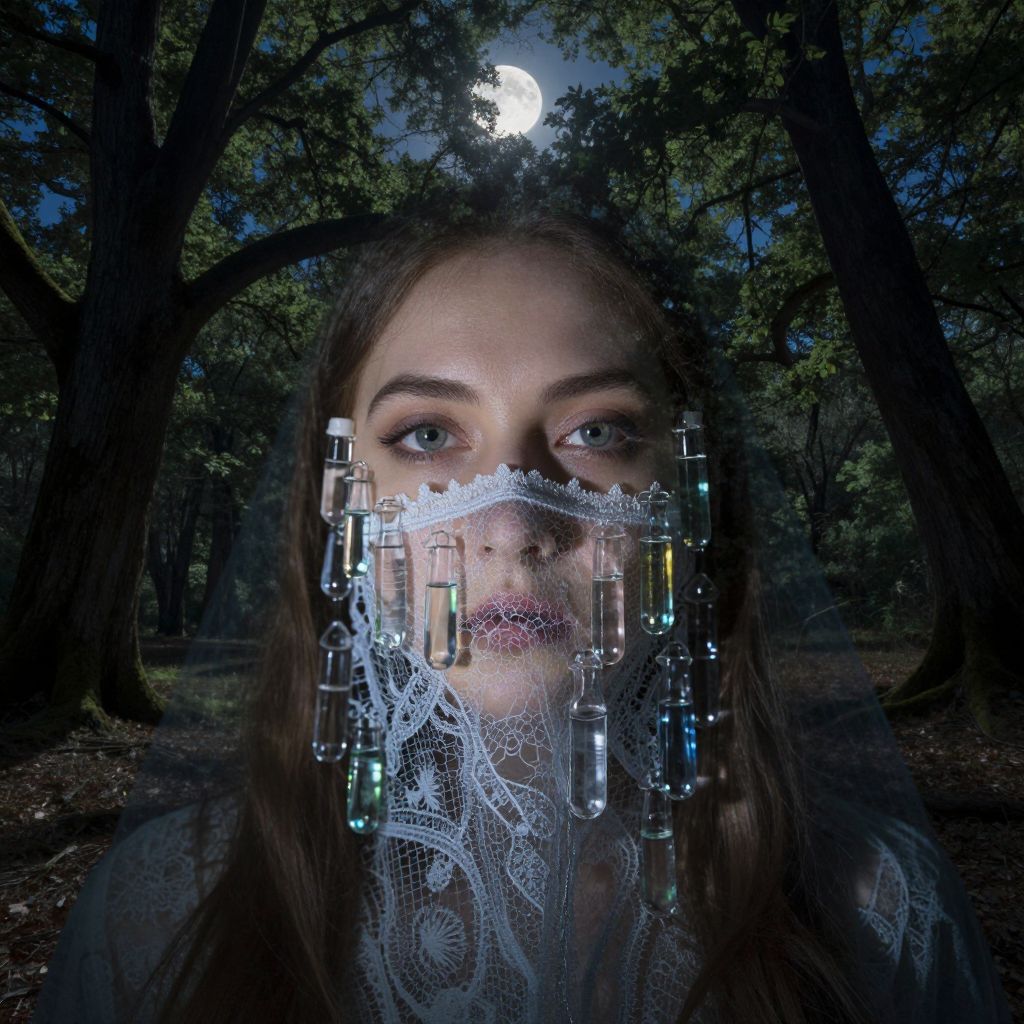 Photograph of a woman with long brown hair, blue eyes, wearing a face mask of lace, glass bottles, and a crescent moon in a