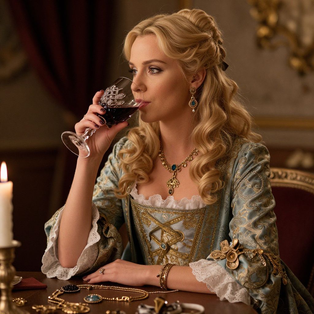Blonde woman elegantly dressed in baroque-inspired attire sips red wine from a crystal glass while seated at a dimly lit table adorned with ornate jewelry and surrounded by warm ambient lighting.