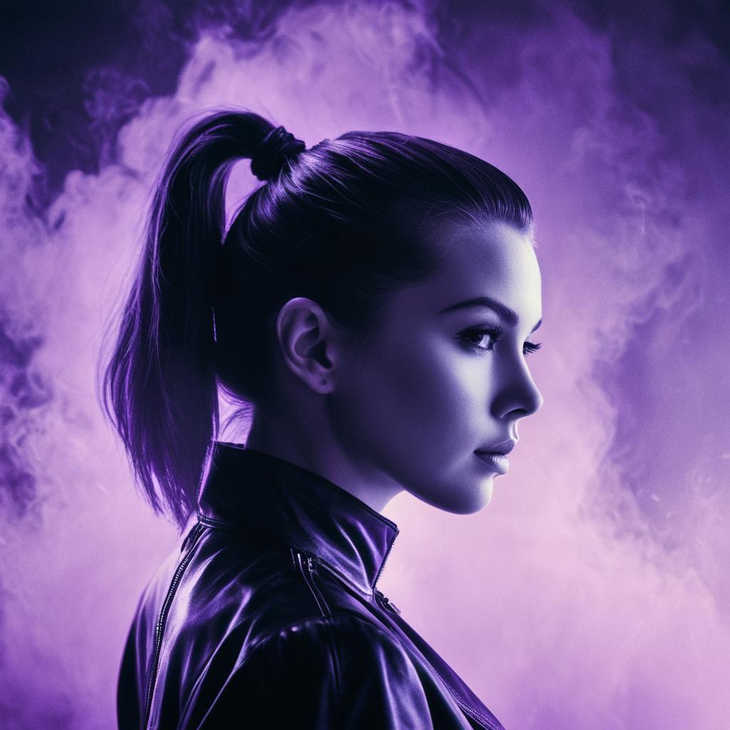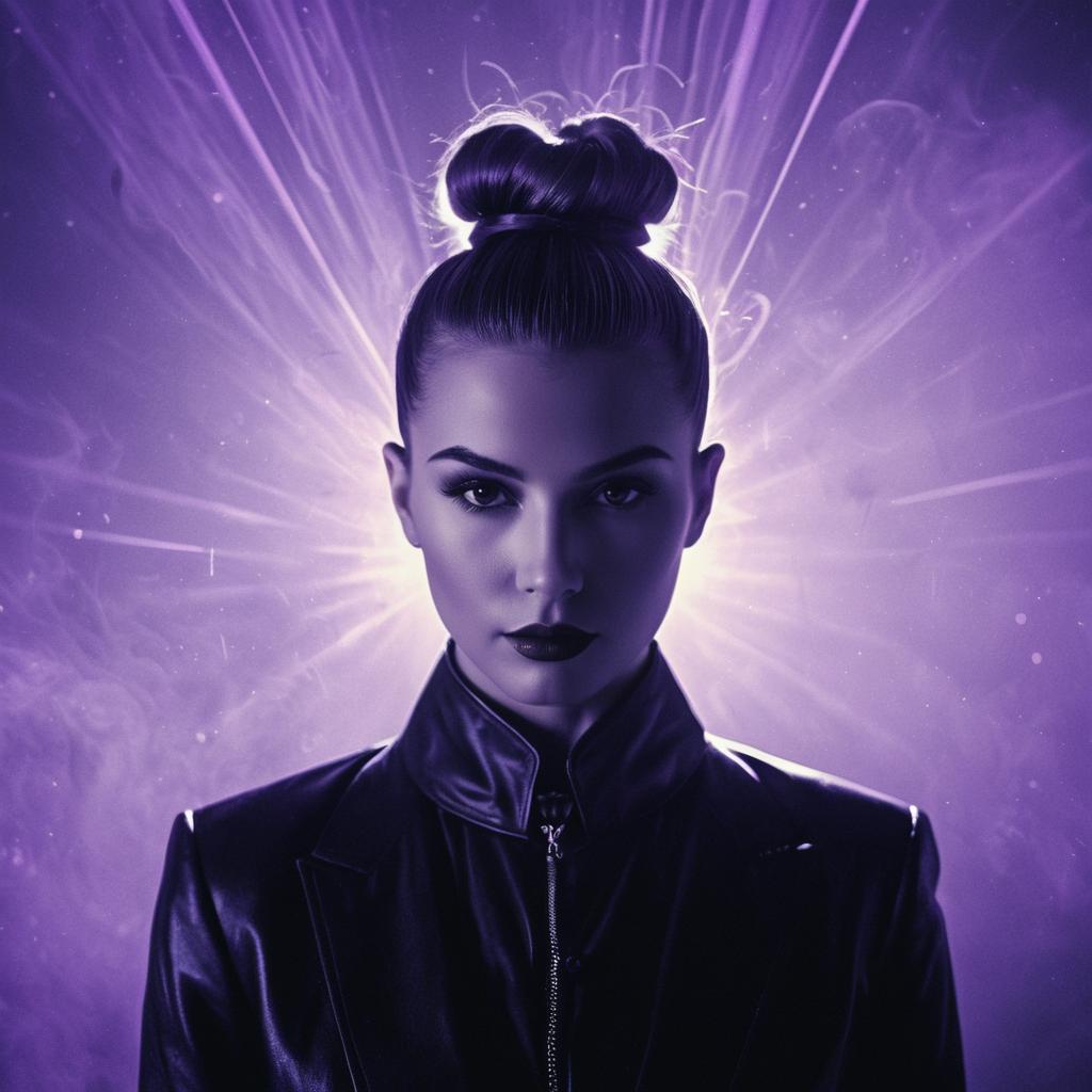 Portrait of a young woman styled as a retrofuturistic detective with a messy bun hairstyle. She wears a glossy purple trench coat and poses against a neon purple circular light background, enveloped in a translucent lilac glowing haze that creates a dreamy, ethereal atmosphere. The lighting emphasizes her sharp facial features and contemplative expression, evoking a film noir mood with a futuristic twist.