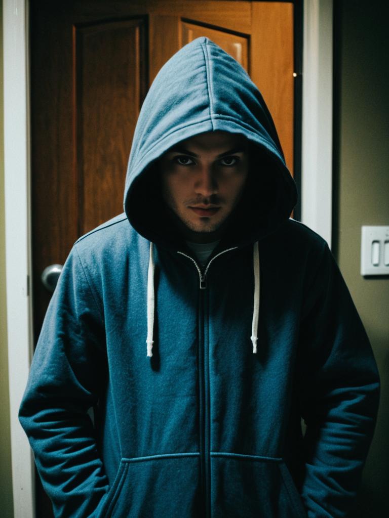 Dont hug scared costume, solo, 1boy, male focus, looking at viewer, hood, closed mouth, hood up, standing, door, indoors, pocket, arms at sides, realistic