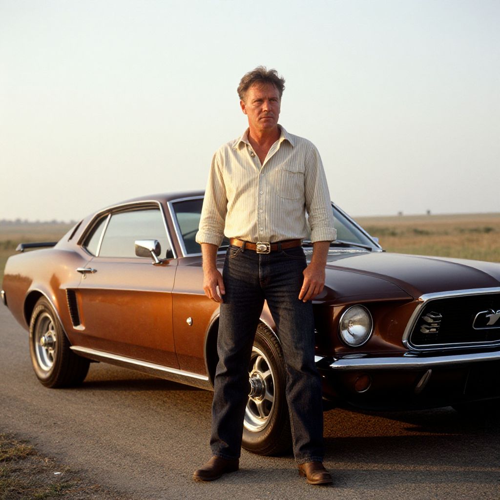 Vintage American landscape: A rugged individualist stands tall beside his prized 1969 Ford Mustang Mach 1, gleaming chrome accents reflecting warm sunlight. Soft focus, gentle haze, rich Kodak Ektachrome tones evoke nostalgia for the open road, freedom's call, and memories of a bygone era. Man has masculine face and piercing eyes