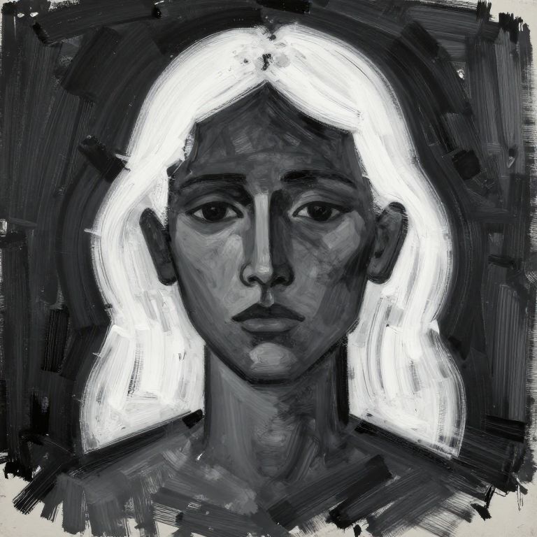 Abstraktes Porträt mit weißen Haaren, expressionistischer Stil, kräftige Pinselstriche in Schwarz und Weiß, kontrastreiche Schatten, emotionale Intensität, minimalistische Farbpalette, moderne Kunst, Fokus auf Textur und Bewegung.